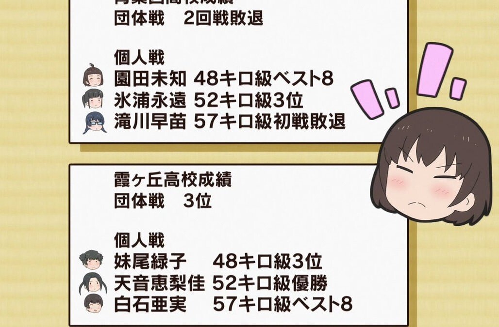 ・個人戦の方も見せてほしかったなぁ、あと安奈も、いやこれは柔道アニメだったな。
